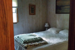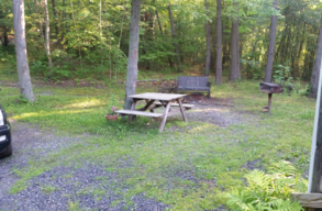 Cabin #1 has just three steps up to the porch and then everything is on that level. It was formerly a 2-bedroom plan, but we took out a wall to open up the living space so it is now a 1-bedroom deluxe. There is an L-shaped living room/dining room/kitchen. The bedroom has a queen bed and there is a sleeper sofa in the living room. The bathroom has a shower but no tub. This cabin has a picnic table and charcoal grill down near the campfire ring.