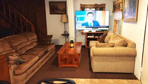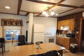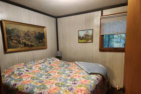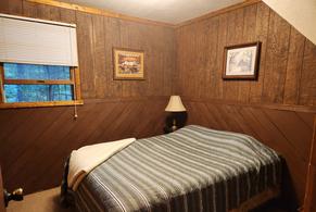 Cabin #2 sits deeper into the woods and is very shady in the summer. This cabin has a picnic table and lots of chairs on the roofed porch. A charcoal grill is near the campfire ring to the left of the porch. One bedroom has a king bed. The second bedroom has a queen bed. There is a full bath with tub and shower along with the living room and kitchen. All these rooms are on the main floor. The third bedroom is upstairs and has 4 single beds.