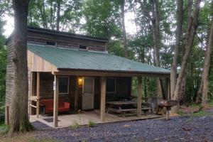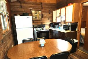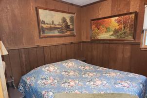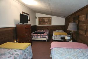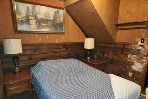 Cabin #4 is at the end of the driveway and up the hill. It faces away from the other cabins and has a sunny exposure with a grassy yard. Cabin 4 has a picnic table and stacking chairs on the roofed porch. There is a charcoal grill just off the porch and a campfire ring off to the side. One bedroom has a king bed. The second bedroom has a queen bed. There is a full bath with tub and shower along with the living room and kitchen. All these rooms are on the main floor. The third bedroom is upstairs and has 3 single beds and 1 double bed.